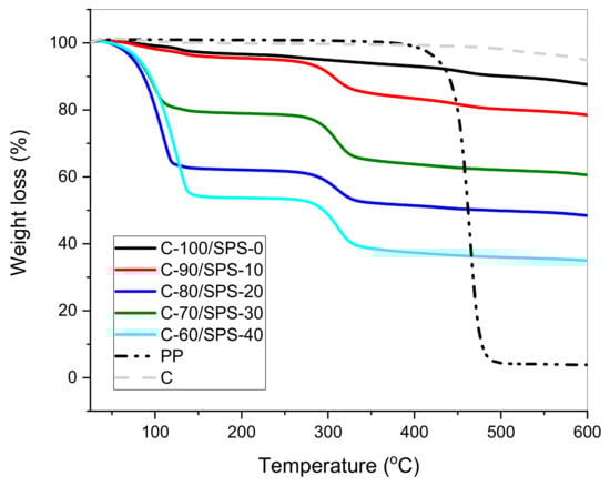 TGA is a standard method for the measurement of weight loss with respect to time or temperature. The thermal stability of C/SPS char briquettes with various loadings of SPS was ascertained by using TG and DTG curves, as shown in Figure 8 and Figure 9, respectively, under non-isothermal conditions, with a heating rate of 10 °C/min, in the temperature range 25–600 °C. From Figure 8, raw PP shows a single degradation step. PP degradation began at a lower temperature of 400 °C, due to the fact that each PP polymer chain carbon atom composed of the polymer branching is tertiary carbon. The decomposition of PP chain branches and double-bonded backbones with a weight loss of 97 % occurred at temperature range of 400–500 °C. Whereas the residue after 550 °C was annotated as solid product of carbon-rich char [,].