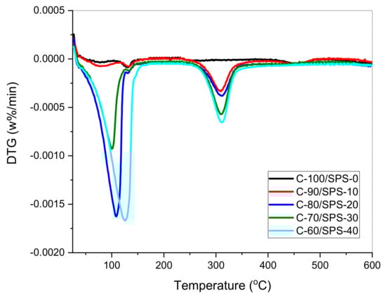 On the other hand, the first stage of thermal decomposition of char briquettes C-100/SPS-0, C-90/SPS-10, C-80/SPS-20, C-70/SPS-30, and C-60/SPS-40, in the temperature range of 25–140 °C, with a weight loss of approximately 1.33, 2.36, 18.53, 36.52, and 44.67%, respectively, was attributed to the removal of adsorbed water molecules on the surface of the char briquettes. Similar reactions happened towards un-briquetted char sample, C, as shown in Figure 8. The weight loss was due to the presence of SPS, which enhanced the hydrophilic nature of the composites []. The second phase, within the temperature range of 250–600 °C, was associated with the condensation reaction of hydrocarbons and the formation of coke. This phase is an active phase of pyrolysis, characterized by a large weight loss of approximately 15 %, where a great quantity of volatile matter and gases is generated. The degradation occurred as a result of (1) the formation of free radicals during the initiation of degradation of the polymer chains, and (2) the diffusion of volatile degradation products []. In addition, the DTG curves also define the characteristics of two phases of char degradation. Figure 9 shows the DTG curves for char briquettes C-100/SPS-0, C-90/SPS-10, C-80/SPS-20, C-70/SPS-30, and C-60/SPS-40 under non-isothermal conditions, with a heating rate of 10 °C/min in the temperature range 25–600 °C. The weight loss rate of the char briquettes reduces in intensity with the increase of SPS loading.