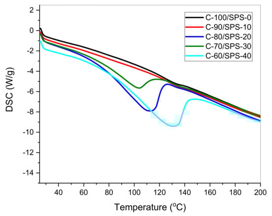 The DSC curves illustrated in Figure 10 explain the heat flows of char briquettes with 0, 10, 20, 30, and 40% SPS loading, associated with thermal decomposition. In addition, the DSC curves provide details about the changes in enthalpy and the onset temperature of physical and chemical changes. Thus, as shown in Figure 10, the DSC curves indicate that there are endothermic (heat absorption) peaks at 100–140 °C under a deoxygenated environment. The endothermic peak attributed to the melting point of the char briquettes varied in the range of 100–140 °C, whereas no clear peak showed the decomposition temperature of the composites. Thus, there is no conclusive decomposition temperature, Td. This is due to the absence of exothermic or endothermic peaks. These results are supported by previous works [,,].