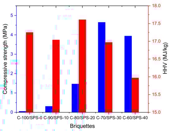 On the other hand, the briquettes with the most resistance to the application of compression were the C-70/SPS-30 briquettes, with 4.65 MPa compressive strength—improved 9194% from the neat char briquettes (0.05 MPa). This rapid enhancement in mechanical properties is due to the loading of starch agglomerates, which bind successfully with the char particles, making them stronger than those made with a lower amount of SPS as a binder. This observation is in keeping with previous works on char briquettes [,,,]. However, the calorific values (HHV) and mechanical properties of the char briquettes need to be considered in order to select the most suitable briquettes for fuel application and other domestic uses. From Figure 11, we concluded that C-70/SPS-30 briquettes displayed optimal mechanical and combustion properties of 4.647 MPa and 17 MJ/kg, respectively.
