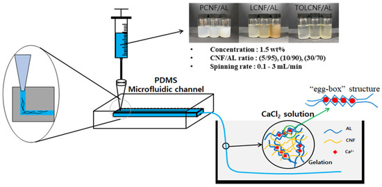 AL (4.5 g) was dissolved in distilled water (295.5 mL) at 60 °C for 8 h under constant stirring at 200 rpm to a 1.5 wt% concentration. PCNF, LCNF, and TOLCNF were mixed with AL solution at ratios of 5/95, 10/90, and 30/70 (CNF/AL). After the syringe was equipped with the PDMS microfluidic channel with a size of 0.2 × 0.1 × 70 mm3 (width × height × length), CNF/AL spinning suspensions were wet-spun into a coagulation bath of 10% CaCl2 solution. The spinning rates were set to 0.1, 1, and 3 mL/min. The obtained wet-spun microcomposite filaments were air-dried for 24 h then oven-dried at 100 °C for 1 h. A schematic representation of the coagulation of the CNF/AL spinning suspension with CaCl2 is shown in Figure 1.