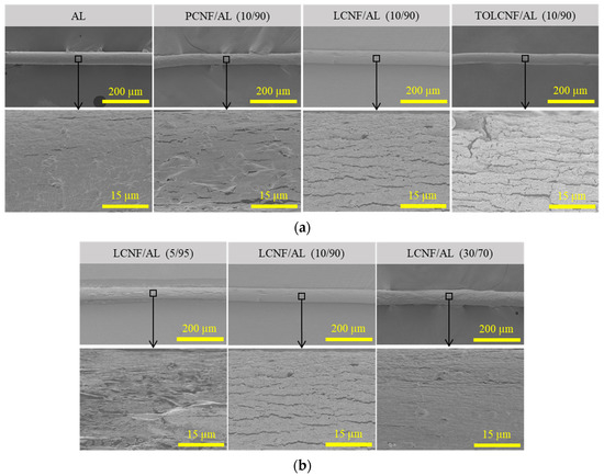 Figure 6 shows the effect of CNF type and content on the tensile strength, elastic modulus, and elongation at break of the microcomposite filaments. In filaments of PCNF/AL, LCNF/AL, and TOLCNF/AL, the tensile strength and elastic modulus tended to increase as the CNF content increased up to 10%, whereas the samples with 30% CNF had a smaller tensile strength and elastic modulus compared to the filaments with 5 and 10% CNF. Deepa et al. (2016) [12] prepared CNF/AL nanocomposite films and investigated the effect of CNF content (2.5, 5, 7.5, 10, and 15%) on the mechanical properties of the nanocomposite films. They reported that the AL film with 10% CNF exhibited the highest tensile strength and elastic modulus. The overdosed CNFs can lead to the aggregation of CNFs, which disrupts the “egg-box” assembly in AL. This may deteriorate the tensile properties of the microcomposite filaments [24]. In microcomposite filaments, the tensile strength and elastic modulus were in the order of LCNF/AL > PCNF/AL > TOLCNF/AL. In general, LCNF products show lower tensile strength and elastic modulus than PCNF products because hydrophobic lignin can deteriorate hydrogen bonding between nanofibrils. Nevertheless, the LCNF/AL microcomposite filament had a higher tensile strength and elastic modulus than the PCNF/AL filament. LCNF was defibrillated very well, indicating a smaller average diameter than PCNF due to DES pretreatment using ChCl/LA. This may contribute to improved hydrogen bonding between the LCNFs, resulting in improved tensile properties of the LCNF/AL microcomposite filament. However, although TOLCNF had a smaller diameter than PCNF and LCNF, the TOLCNF/AL filaments exhibited a lower tensile strength and elastic modulus. This phenomenon can be explained by the incorporation of TOLCNF and Ca2+. When the TOLCNF/AL suspension was wet-spun in a CaCl2 solution, the carboxyl groups in TOLCNF generated ion bonds with Ca2+. This may interfere with the generation of the “egg-box” structure and the gelation of AL, resulting in a deterioration in tensile properties. The elongation at break of the wet-spun microcomposite filaments was observed in the order of LCNF/AL > TOLCNF/AL > PCNF/AL. Regardless of the type of CNF, the elongation at break of the wet-spun microcomposite filaments significantly increased at 5% CNF content and gradually decreased.