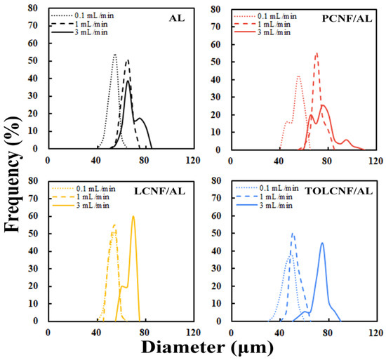 The effects of the CNF/AL ratio and spinning rate on the diameter distribution of the wet-spun microcomposite filaments are described in Figure 4 and Figure 5. In all samples, the diameter of the filaments increased with increasing CNF content and spinning rate. The average diameter of the wet-spun microcomposite filaments dependent on CNF type, CNF/AL ratio, and spinning rate are summarized in Table 3. The diameters of the microcomposite filaments made of PCNF/AL, LCNF/AL, and TOLCNF tended to increase with the increasing content of CNF. At a spinning rate of 1 mL/min, the average diameters of CNF containing AL filaments were less than that of pure AL filaments, even at a CNF content of 30% (except for PCNF/AL). For PCNF/AL, the average diameter was slightly higher than that of AL at a CNF content of 30%. This observation indicates the great compatibility and attractive forces between the two hydrophilic biopolymers. At a low content (5%), CNF is uniformly distributed in the AL matrix, and with maximum attractions, the filaments shrink and exhibit a minimum diameter. With the increase in CNF content, possible aggregation of CNF leads to increased filament diameters. Among CNF types, the diameter order of microcomposite filament was found to be PCNF/AL > LCNF/AL > TOLCNF/AL. The high diameter of PCNF/AL might be due to the high PCNF diameter. TOLCNF/AL exhibited the smallest diameter, which can be ascribed to both the small diameter of TOLCNF and possible binding of carboxyl groups with Ca2+ ions causing filament shrinkage. The increase in spinning rate also led to an increase in the average diameter of the microcomposite filaments. The average diameters of wet-spun AL filaments without CNF also increased with increasing spinning rate. This behavior is commonly observed in AL-based wet-spinning. For instance, in microfluidic wet spinning of chitosan-alginate microfibers, Lee et al. [23] observed almost a linear increase in the fiber diameter with the sample flow rate.