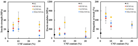 Effect of CNF content on tensile strength, elastic modulus, and elongation at break of the wet-spun microcomposite filaments made of 1.5 wt% AL, PCNF/AL, LCNF/AL, and TOLCNF/AL spinning suspension at a spinning rate of 1 mL/min.