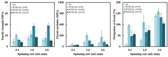 Effect of spinning rate on tensile strength, elastic modulus, and elongation at break of the wet-spun microcomposite filaments made of 1.5 wt% PCNF/AL with different CNF/AL ratios.