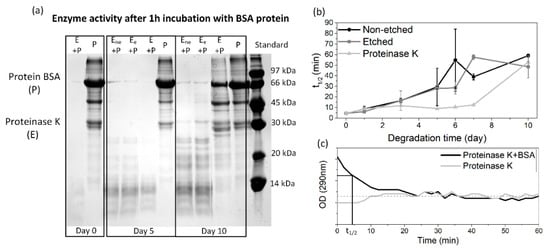 (a) SDS-page results for the enzymatic activity of the initial solution and after 5 and 10 days of degradation for enzymes in non-etched (Ene), etched (Ee) and control solutions (E), where activity was verified with degradation of the BSA protein (P); (b) calculated half time needed for BSA protein degradation for enzymes in non-etched, etched and control solutions, determined from measured optical density at 290 nm for each solution, where graph (c) presents the absorbance measurements for initial proteinase K solution with a marked half time of total degradation (t½).