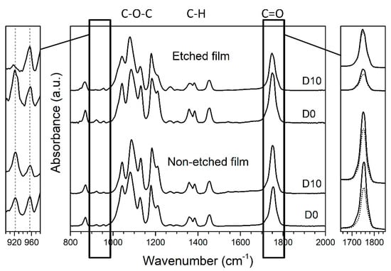 ATR FT-IR spectra (normalized to maximum peak absorbance) for non-etched and etched PLLA films (middle), degraded for 10 days in enzymatic solution (D10), compared to initial PLLA film (D0). On the (left), an enlarged, normalized spectrum between 900 and 980 cm−1 is presented to observe changes in the intensity of peaks that are specific for more crystalline (921 cm−1) or more amorphous (956 cm−1) films. On the (right), a polarizer was used to determine the changes in orientation of the C=O peak, comparing the intensities of horizontal (solid line) and vertical (dotted line) orientations without normalization of the spectra.