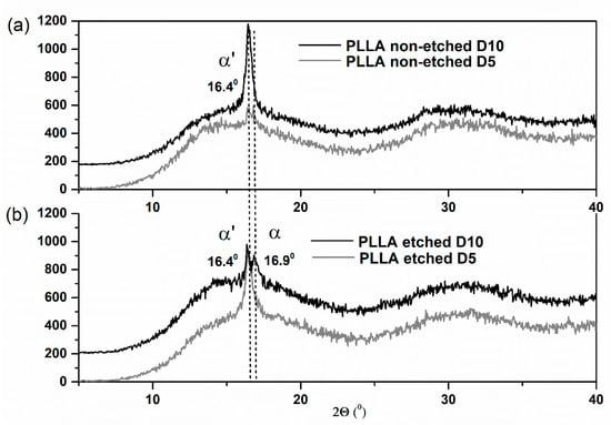 Similar structural changes were revealed during the XRD study (Figure 4). As with the FTIR analysis, the XRD results clearly indicate the large increase in crystallinity of the non-etched samples. The polymer is in the α′ phase since the specific (200)/(110) peak appears at the 2-theta position lower than 16.6°, following a previous report []. After 10 days, the additional, more ordered α phase is observed only for the etched film, detected as an additional XRD peak at 16.9° (Figure 4b).
