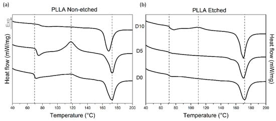 Investigating the thermal properties of PLLA films also revealed different responses to enzyme-catalyzed degradation for the etched and non-etched samples (Table 1, Table 2 and Figure 5). For the etched samples, the melting peaks are broad for all the measured samples, indicating the presence of both crystalline forms: α′ and α. Degradation promotes recrystallization (α′ to α) since they are both detected in the final degradation stage, as seen in the XRD data. The crystallinity of the etched films, measured using DSC, is initially high (since etching removes part of the amorphous regions), and it was not changed much during the degradation. However, for non-etched samples, even though it starts at a lower value, the crystallinity increased significantly after 10 days of degradation, as also observed from the FTIR and XRD analyses. While the glass and melting temperatures (Tg and Tm) were shifted for non-etched films during degradation, similar changes were not observed in the etched films. H. Tsuji et al. also observed increased Tg values for the oriented and un-oriented films; therefore, Tg changes respond to the degradation process, like changes in the highly ordered structure, such as crystallinity or orientation [].