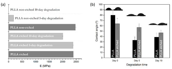(a) changes in Young’s modulus (at 23 °C) and (b) changes in wetting angle for water drop on polymer, for non-etched and etched samples after 0, 5 and 10 days of degradation.