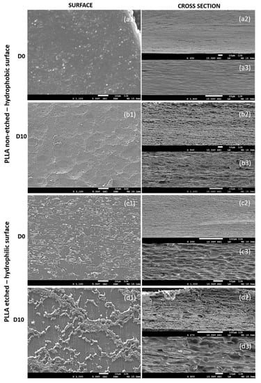 SEM images showing surfaces (1) and cross-sections (2, 3) of PLLA films with non-etched hydrophobic (a1–a3,b1–b3) and etched hydrophilic (c1–c3,d1–d3) surfaces before (D0) and after (D10) degradation with proteinase K.