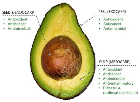 Avocado parts and properties. Reprinted with permission from Bhuyan et al. The Odyssey of Bioactive Compounds in Avocado (Persea americana) and Their Health Benefits. Antioxidants. Copyright (2019) MDPI [21].