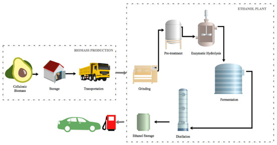 Bioethanol production from avocado’s cellulosic biomass. Reprinted with permission from Karagoz P et al. Lignocellulosic ethanol production: Evaluation of new approaches, cell immobilization and reactor configurations. Renewable Energy. Copyright (2019) Elsevier [93].