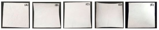 Tearing resistance of paper samples was analyzed by a tearing strength tester (Kumagai Riki Kogyo Co., Ltd., Tokyo, Japan) according to TAPPI T 414 om-12 (Elmendorf method) []. Test specimens were prepared in rectangular size of 6.3 cm × 10 cm. The tear resistance force (N) was recorded and then calculated the tear index according to the following Equation (4):