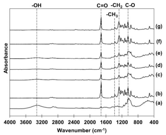 FTIR spectra of (a) non-coated PLFP, (b) commercial P(3-HB) film, (c–e) commercial P(3-HB) coated PLFPs at 5%, 7.5% and 10% (w/v), (f) biosynthesized P(3-HB) film and (g) biosynthesized P(3-HB) coated PLFP at 7.5% (w/v).