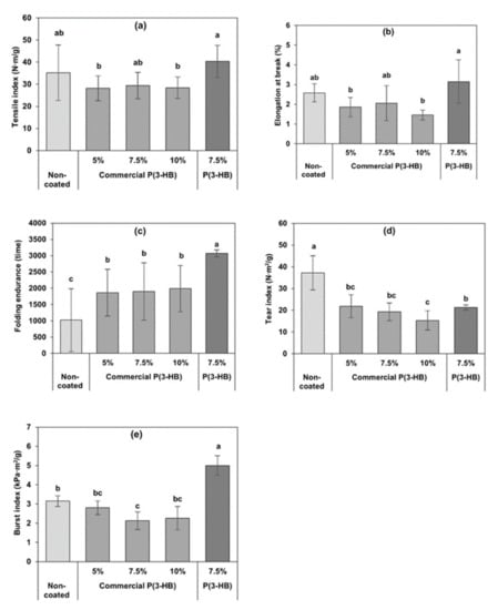 Mechanical properties of the non-coated PLFP, the commercial P(3-HB) coated PLFPs at 5%, 7.5% and 10% (w/v) and the biosynthesized P(3-HB) coated PLFP at 7.5% (w/v) including (a) tensile index, (b) elongation, (c) folding endurance, (d) tear index and (e) burst index. Different letters above graph bars re represent the different between the averages of each parameter at significance level of p ≤ 0.05.