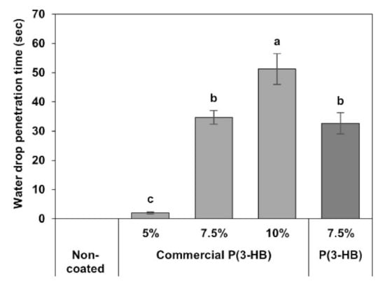 Water drop penetration time on surface of the non-coated PLFP, the commercial P(3-HB) coated PLFPs at 5%, 7.5% and 10% (w/v) and the biosynthesized P(3HB) coated PLFP at 7.5% (w/v). Different letters above graph bars are represent the different between the averages of each parameter at significance level of p ≤ 0.05.