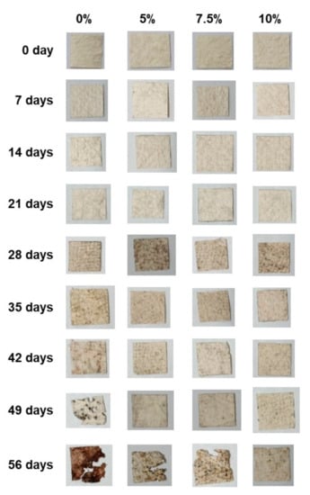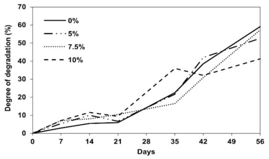 The coated PLFPs, having predominant mechanical properties and acceptable water drop penetration time, were selected to evaluate and compare the biodegradability. The biosynthesized P(3-HB) coated PLFP with varying contents (0%, 5%, 7.5% and 10% (w/v)) were buried into the moist soil for a period of 56 days at 63 °C. The visual appearance of degraded paper samples recovered at different testing times are presented in Figure 6. It was observed that the residual samples at 49 and 56 days were darker and more fragile, as could be seen in non-coated PLFP and PLFP coated with 5% and 7.5% (w/v) of P(3-HB). In addition, it was noticeable that increasing of P(3-HB) content to 10% (w/v) decelerated the degree of degradation of the coated paper (42% after 56 days), while the non-coated and P(3-HB) coated PLFP at 5% and 7.5% (w/v) showed higher degree of degradation around 53–60% after 56 days (Figure 7.). This result might be due to the high amount of crystalline P(3-HB), which slowed down the degradation phenomenon []. However, the rate of biodegradation of biocomposites depends on many environmental factors such as moisture, light (radiation), temperature and microorganisms []. Among these factors, P(3-HB) degradation is mainly enzymatically degraded by various kinds of microorganisms existing in natural soils []. Thus, the microbial communities in soil, which are responsible for biodegradation of the P(3-HB) coated PLFP should be evaluated for further study.