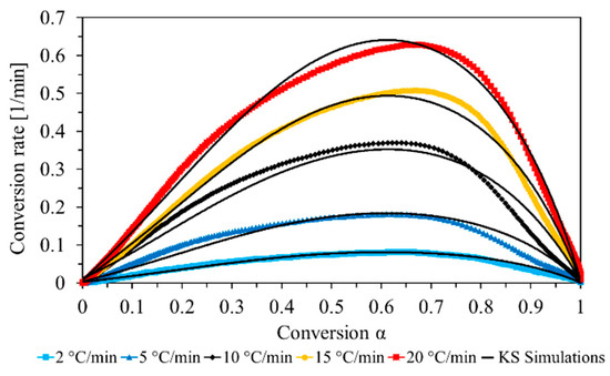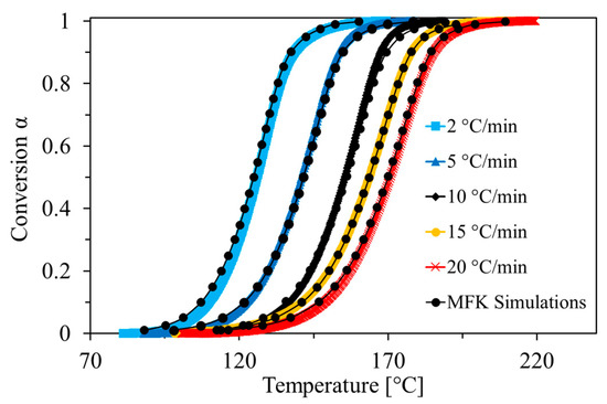 The simulated conversion rates and conversions based on the Kamal-Sourour model together with the data from the actual measurements are shown in Figure 4. The model simulation, in principle, correlates very well with the experimental data for all temperature profiles. The best matches are found for the high heating rates (15 and 20 °C/min) where the EMC is heated up rapidly. For the lower heating rates (2, 5 and 10 °C/min) the simulation fits are still good, but they do not perfectly coincide with the measured data. This is especially visible in Figure 4b for the heating rate of 2 °C/min, where at the beginning (α < 0.1) and at the end (α > 0.9) the simulation predicts a faster reaction than is observed in the measurement. The minor deviation at the end can be attributed to the effect of entering the diffusion-controlled regime. This means that the Kamal-Sourour model may not describe the diffusion-controlled regime with sufficient accuracy without the implementation of an additional diffusion factor [24,41,42]. Hence, compared to the model-free approach, the predictions obtained by the model-based approach seems to suffer in precision. This will be verified when later in this work, the two DSC based kinetic models will be compared (see Section 3.4, Figure 9b).