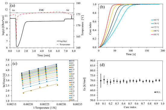 DEA evaluation: (a) ion viscosity and temperature plotted against time (b) Cure index at different isothermal temperatures plotted against time; (c) natural logarithm of time plotted against the reciprocal of the absolute temperature (integral isoconversional method) at specific cure indeces with the corresponding regression lines; (d) apparent activation energy Ea plotted against the cure index with standard error.