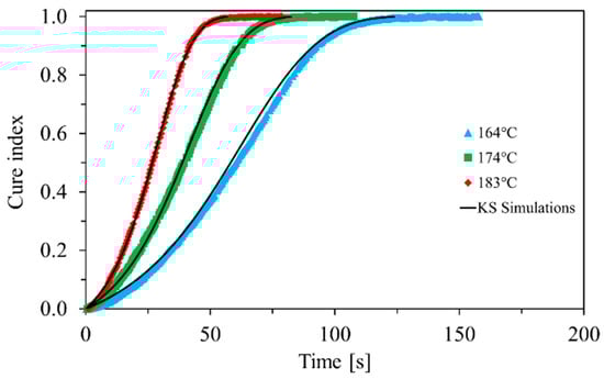 To show the validity of the model parameters (Figure 6) three additional isothermal measurements at 164 °C, 174 °C and 183 °C that had not been used for the model building are compared with the respective MFK simulations by plotting the cure index versus time. The agreement between the measured data and the iso-conversional simulations is very well. This demonstrates that an accurate kinetic characterization of the cross-linking reaction can be achieved by applying the integral iso-conversional method to the real-time DEA-data recorded inline during the curing of EMC within the transfer molding process.