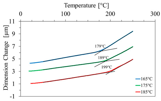 TMA graph of isothermal cured samples, at 165 (blue), 175 (green) and 185 °C (red) for 360 s; Tg is determined by intersection of two tangents on TMA curves and indicated for each measurement (curves are artificially shifted along Y axis for better visibility).
