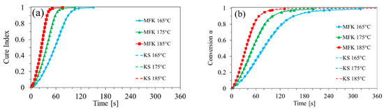 Cure simulations based on DEA (a) and DSC (b) with model free kinetics (MFK) and the Kamal-Sourour model fitting (KS) for a time period of six minutes corresponding to the cure time inside the mold tool.
