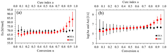 DEA and DSC: Comparison of the apparent activation energies (a) and apparent pre-exponential factors (b) determined via isoconversional methods of DEA (black dots) and DSC (red squares) with the corresponding standard errors.