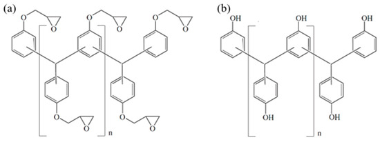 Basic chemical structures of the used multifunctional epoxy resin (a) and the multifunctional phenolic hardener (b).