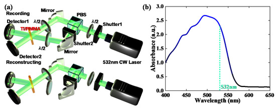 (a) Recording and reconstructing approaches for holographic measurement, (b) light absorption spectrum of TI/PMMA polymers at the range of 400–650 nm.