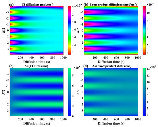 The whole grating formation of the DDEP included three stages: photoinitiated polymerization, dark diffusion of the photo-initiator, and the reverse diffusion of photoproducts. During the second step, the diffusion of the photo-initiator, TI molecules (from the dark fringe to bright fringe regions), were the main requirement for improving the grating strength, while the third step, the reverse diffusion of photoproducts (from the bright fringe to dark fringe regions, named anti-diffusion), could attenuate the holographic grating. Figure 3 depicts the diffusion distributions and refractive index modulations of the TI molecules and photoproducts during the dark diffusion process. The refractive index modulation was calculated using Equation (4) [31], where NTI and NPhotoproduct are the constants related to the refractive indices of TI molecules and photoproducts. Here, the refractive indexes of the TI molecules, photoproducts and substrates were 1.6298, 1.5005 and 1.4760, respectively. It was possible to improve the refractive index of the TI concentration gradient by the order of 10−6, while the distribution of the photoproduct could only be influenced by a level of 10−7. Overall, the DDEP improved holographic grating strength following a long diffusion due to the refractive index modulation of the TI molecules.