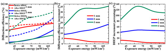 Effect of exposure energy on DDEP of materials with different thickness: (a) maximum diffraction efficiency, (b) diffraction efficiency increment, (c) DDEP increment percentage.