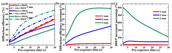 Effect of pre-exposure time on the DDEP of materials with different thickness: (a) maximum diffraction efficiency, (b) diffraction efficiency increment, (c) DDEP increment percentage.