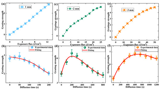 The evolution of grating strength during the pre-exposure and dark diffusion process: (a,b) 1 mm, (c,d) 2 mm, (e,f) 3 mm.