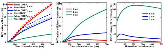 Effect of short-time duration on single shot DDEP of materials with different thickness: (a) maximum diffraction efficiency, (b) diffraction efficiency increment, (c) DDEP increment percentage.