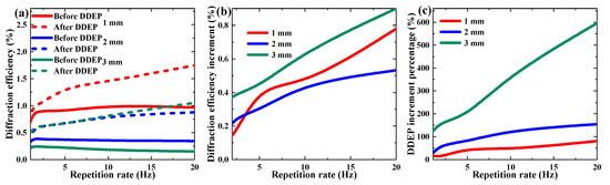 Effect of repetition rate on multi-shot DDEP of materials with different sample thickness: (a) maximum diffraction efficiency, (b) diffraction efficiency increment, (c) DDEP increment percentage.