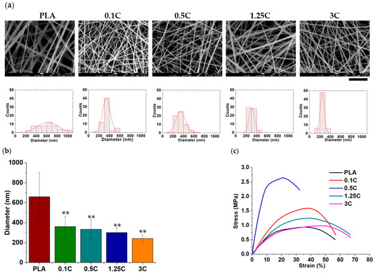 Characteristics of MWCNT-containing PLA nanofibers. (a) The morphology and size distribution of nanofibers were examined by SEM analysis. (scale bar = 5 µm); (b) the average size of MWCNT-containing nanofibers. (**: p < 0.01 compared to the pristine PLA group); (c) mechanical performances of nanofibers were evaluated by a tensile test.
