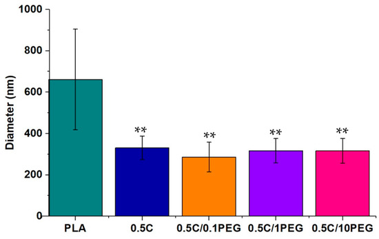 Characteristics of PEG-containing nanofibers: (a) the hydrophobicity of the nanofibers was evaluated by water contact analysis. (*: p < 0.05, **: p < 0.01 compared to the pristine PLA group; ##: p < 0.01 compared to the 0.5 C/10PEG group) (b) The morphology and size distribution of nanofibers were examined by SEM analysis. (scale bar = 5 µm) (**: p < 0.01 compared to the pristine PLA group).