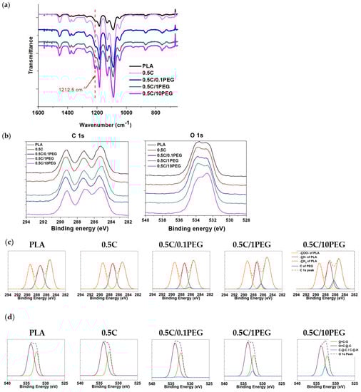 We also applied FT-IR and XPS analysis to examine functional groups of nanofibers (Figure 3). For the FT-IR analysis, there is a specific peak of PEG at 1212.5 cm−1, which is correlated to the stretching vibration of C-O in the terminal of PEG chains (Figure 3a) [35]. This peak increased with the concentration of PEG in electrospun solution. The results of XPS spectrometry demonstrate a similar trend. The peaks of C 1s and O 1s highly depend on the composition of nanofibers (Figure 3b). Considering the structure of PLA and PEG, C 1s can be resolved into 4 peaks (Figure 3c) The peaks of 289.3 ± 0.1, 287.3 ± 0.1, and 285.3 ± 0.1 eV are carbons assigned to the –COO, –CH–, and –CH3 of PLA, and the carbon of PEG contributed to the peak of 286.3 ± 0.1 eV [36]. Similarly, O 1s can be resolved into three peaks, i.e., 532.2 ± 0.2, 533.7 ± 0.2, and 532.8 ± 0.2 eV, which represent the carboxyl group (O=C–O–C) of PLA, the ester group (O=C–O–C) of PLA, and the alcohol (C–O–H) as well as ether (C–O–C) groups of PEG, respectively (Figure 3d) [37]. The area ratios of these resolved peaks are listed in Table 2 and Table 3. The nanofibers prepared by polymer solutions containing more PEG exhibited higher area ratios of 286.3 ± 0.1 eV and 532.8 ± 0.2 eV in C 1s and O 1s, respectively. Both FT-IR and XPS results suggest that PEG is successfully incorporated in nanofibers.