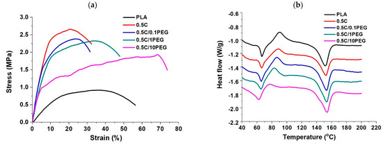 Thermal transition of the nanofibers was examined by DSC analysis (Figure 4b), and their glass transition temperature (Tg), crystal temperature (Tc) and melting point (Tm) were determined through the DSC curves (Table 5). Because MWCNTs restrict the movement of PLA chains, the Tg of 0.5 C is slightly higher than that of the pristine PLA [39]. In addition, the proportionality of Tg of composite materials to their weight fraction can evaluate the compatibility of composite materials [40]. The glass transition temperatures (Tg) of PEG and PLA are −60 and 62.5 °C, respectively, so the Tg of the composite fibers decreased with increasing PEG ratios. Furthermore, their Tg are directly proportional to their weight ratios, suggesting that the added PEG can be evenly blended with PLA without phase separation. Crystal temperature (Tc) is the endothermic peak of DSC curve. Different studies indicated that the addition of nanomaterials serve as nucleated agents [41,42], and thus Tc of the 0.5 C group was lower than that of the pristine PLA fibers. Because PEG is a soft molecule, Tc of pure PEG is 40.5 °C, which is much lower than that of PLA [40]. The blended PEG may reduce the energy barrier to facilitate crystal formation, and thus the Tc decreases with increasing PEG. For the Tm results, MWCNTs slightly increase Tm due to their entanglement effect that higher energy is required to relax polymer chains. However, PEG addition does not significantly affect Tm.