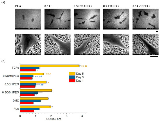 To investigate the viability of cells on nanofibers, an MTT assay was performed (Figure 5b). For the results of the first day, there was almost no difference between the groups, suggesting that the efficiencies of cell adhesion to these nanofibers are almost the same. Regarding the results of the 3rd and 5th days, the cells increased in all groups including the control groups of TCPS, suggesting that cell proliferation is successful in these nanofibers. The results of 0.5 C and pristine PLA are almost the same. In contrast, the cells on nanofibers that contained more PEG demonstrated lower MTT values, but the result of the 0.5 C/0.1PEG group can be maintained as that of the 0.5 C group, suggesting that slightly adding PEG does not affect cell proliferation. Because the hydrophilic property of PEG may reduce protein adsorption, the proliferation of cells grown on PEG containing nanofibers was probably thus affected [43]. However, PEG is a biocompatible material that is FDA approved for clinical use [44]; therefore, PEG should not cause cytotoxicity and should be applicable for tissue engineering.