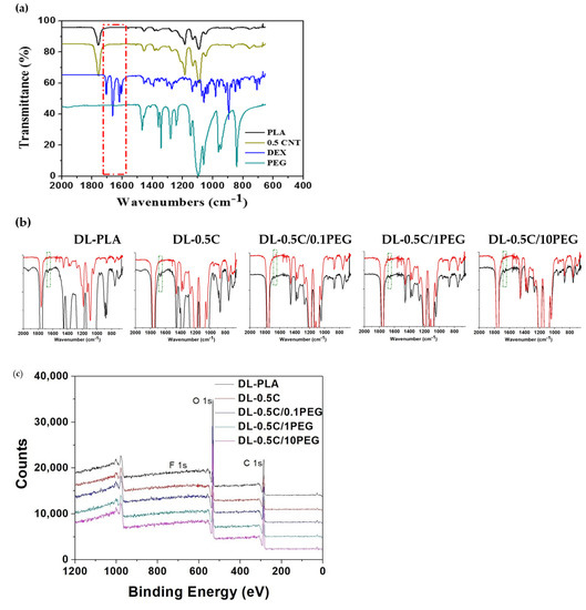 In order to promote osteogenesis, DEX was loaded to nanofibers of pristine PLA, 0.5 C, 0.5 C/0.1PEG, 0.5 C/1PEG, and 0.5 C/10PEG, which are denoted as DL-PLA, DL-0.5 C, DL-0.5 C/0.1PEG, DL-0.5 C/1PEG, and DL-0.5 C/10PEG, respectively. These DEX loaded nanofibers were characterized by FT-IR analysis. The FT-IR spectra showed that there is a specific peak of DEX at 1600~1700 cm−1, which corresponded to the stretching vibration of the carbonyl group of DEX (Figure 6a) [45,46]. In addition, the nanofibers containing DEX all demonstrate this specific peak, suggesting that the DEX is successfully loaded to nanofibers (Figure 6b).