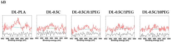 Because the DEX molecule contains the fluorine atom, XPS was applied to evaluate the loading efficiency of the DEX. The peak of F 1s is at 684–688 eV, which can be found in all DEX loaded nanofibers (Figure 6c,d). Therefore, the area of this specific peak is determined, which was normalized by the peak area of C 1s to determine the F/C molar ratio. The experimental and theoretical F/C molar ratios are list in Table 6.