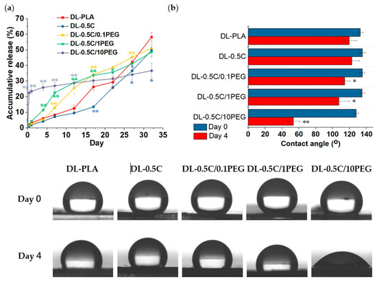 Because PEG is extremely hydrophilic, these PEG chains tend to migrate toward the surfaces of nanofibers when the fibers are immersed in aqueous environment [50], we assume that nanofiber structure may be loosened during PEG migration to cause burst release. However, when these migrated PEG molecules completely cover the surfaces of nanofibers, a dense layer of PEG is formed to eventually retard the release of hydrophobic DEX. To prove our hypothesis, we examined water contact angles of DEX-containing nanofibers before (day 0) and after immersed in PBS for 4 days (Figure 7b). Water contact angles of all nanofibers were all decreased after 4 days in PBS because of the ingress of water to polymers. This reduction was not significant in the DL-PLA and DL-0.5 C groups. In contrast, the results of PEG-containing nanofibers all significantly increased their hydrophilicity that the higher PEG, the lower water contact angles, especially the DL-0.5 C/10PEG group that demonstrated a dramatically reduction of water contact angles from 127.8° ± 2.8° to 53.4° ± 7.3°. These results suggested that PEG migration may affect the hydrophobicity of nanofibers to regulate the release of DEX, and the surfaces of DL-0.5 C/10PEG became highly hydrophilic after immersing in aqueous environment, which thus retarded the release of DEX.