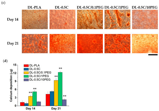 Then, we seeded rBMSCs to DEX loaded nanofibers and cultured them in medium containing ascorbic acid and β-glycerophosphate to evaluate the promotion extent in osteogenic differentiation ability of these nanofibers. The differentiated osteoblasts from rBMSCs can deposit calcium in the extracellular matrix (ECM) as a process called mineralization [51]. The formed mineralized tissue was stained by Alizarin Red S (Figure 7c) and the deposited calcium was quantified by a colorimetric assay of Ca-o-CPC complex method (Figure 7d). When rBMSCs were seeded on fibers for 14 days, there was almost not significant Alizarin Red S staining in the DL-PLA, DL-0.5 C and DL-0.5 C/10PEG groups. However, the bone-like nodules and obvious staining were found in the DL-0.5 C/0.1PEG and DL-0.5 C/1PEG groups, suggesting that these rBMSCs on these fibers began to deposit mineral in ECM [52]. In the late stage (day 21), all nanofibers except the DL-0.5 C/10PEG group successfully led rBMSCs to form mineralized tissue. The quantification results also indicated the same trends. The performances of the DL-PLA and DL-0.5 C groups were almost the same, no matter day 14 or day 21, which were lower than those of the DL-0.5 C/0.1PEG and DL-0.5 C/1PEG groups, and the DL-0.5 C/1PEG group caused the highest calcium deposition. Interestingly, cells grown on DL-0.5 C/10PEG did not increase calcium deposition on day 21, suggesting that DL-0.5 C/10PEG fibers were incapable of inducing osteogenic differentiation.