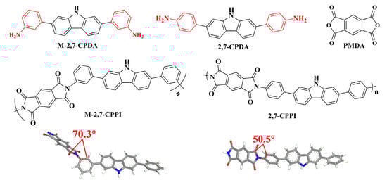 The chemical structures of monomers and the lowest energy conformation of M-2,7-CPPI and 2,7-CPPI repeat units.