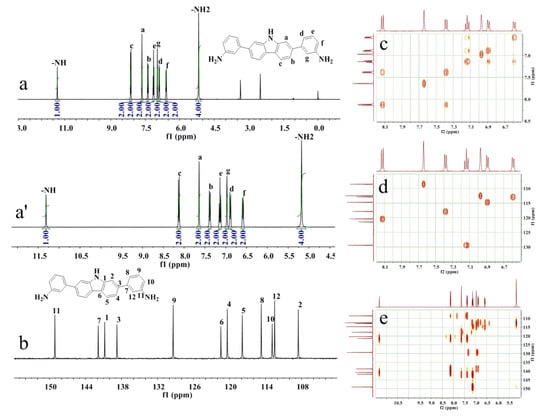1H NMR in the range of 0~13 (a), 1H NMR in the range of 4.5~11.5 (a’), 13C NMR (b), H-H COSY (c), C-H QC (d), and C-H BC (e) spectra of M-2,7-CPDA in DMSO-d6.