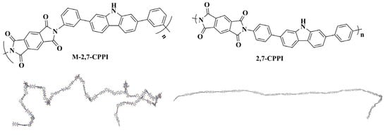 Figure 4 illustrates the polymer chain conformation of M-2,7-CPPI and 2,7-CPPI with 25 repeat units under the lowest energy. The meta-isomer M-2,7-CPPI showed bent and distorted chain structure, whereas that of 2,7-CPPI was linear and regular. In addition, the radius of gyration (Rg) was studied for the two isomeric polyimides. The Rg as a function of time for the equilibrated M-2,7-CPPI and 2,7-CPPI are illustrated in Figure S13. The average Rg values are given in Table 3. 2,7-CPPI showed a larger Rg than M-2,7-CPPI, indicating its more stretched chain structure [].