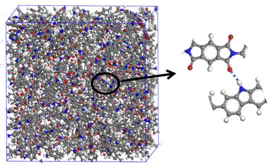 Intermolecular forces also affect chain stacking. For M-2,7-CPPI and 2,7-CPPI, hydrogen bonds can be formed between O=C− and −NH−. The radial distribution functions (gAB(r)) of O atoms in O=C− and H atoms in −HN− were determined for M-2,7-CPPI and 2,7-CPPI to study the hydrogen bonds. The result is given in Figure 5. Hydrogen bond forces are considered to have the distances between atoms of 2.6–3.1 Å []. In Figure 5, peaks were observed in the range of 2.6–3.1 Å for the two PIs, proving that hydrogen bonds were formed. Obviously, 2,7-CPPI displayed a larger g(r) value than M-2,7-CPPI in that range, implying there are more hydrogen bonds in the 2,7-CPPI matrix. Figure 6 illustrates the hydrogen bonds generated in the M-2,7-CPPI cell, verifying the presence of hydrogen bonds between O=C− and −NH−. Statistical analysis indicated that 38 and 49 hydrogen bonds were generated in the M-2,7-CPPI and 2,7-CPPI cells, respectively (Table 3). When the linkage was changed from para to meta, the regularity of polymer chains in M-2,7-CPPI was decreased, and the compact chain stacking was hampered. The less ordered and packed structure of M-2,7-CPPI hindered the formation of hydrogen bonds, leading to a decreased number of hydrogen bonds. This also can be revealed from the cohesive energy density (CED) results in Table 3. The CED of 2,7-CPPI was 570 J/cm3, which decreased to 456 J/cm3 for M-2,7-CPPI. The distorted chain structure and weak hydrogen bonding gave rise to the loose chain packing of M-2,7-CPPI.