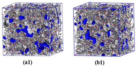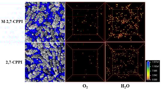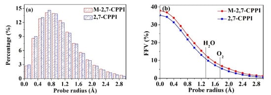 Free volume features, including size distribution and connectivity, were considered as key parameters determining gas transport performance [,]. Molecular simulations were conducted to study the free volume. The distributions of void size were shown in Figure 8a. Compared with para-isomer 2,7-CPPI, meta-based M-2,7-CPPI had a greater number of holes with a radius larger than 0.8 Å, but fewer holes with a radius smaller than 0.8 Å. The kinetic radii of H2O and O2 are larger than 0.8 Å (O2: 1.73 Å, H2O: 1.325 Å). This suggested that M-2,7-CPPI had more cavities for H2O and O2 permeation in comparison with 2,7-CPPI, which led to high gas permeability and therefore decreased barrier performances of M-2,7-CPPI.